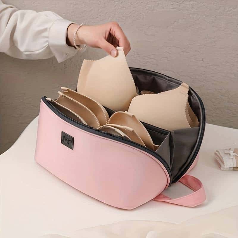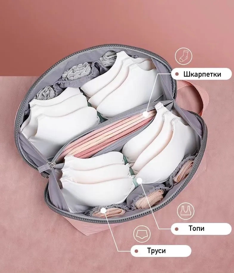 Два основних відділення для бюстгальтерів, шість кишень з боків для трусиків і одне відділення в центрі для гігієнічних засобів. Органайзер закривається на блискавку та має зручну ручку для перенесення.